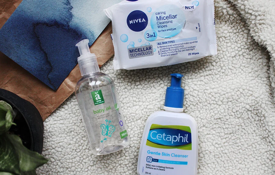 För sminkborttagning svär jag vid någon typ av olja. Enligt mig är olja det billigaste, smidigaste och mest skonsamma sättet att ta bort sminket. Jag använder babyolja för att det är det billigaste alternativet + att det kommer i en flaska med pump. På lata dagar när jag inte orkar köra hela hudvårdsrutinen brukar jag använda sminkborttagningsservetter, dessa från Nivea torkar inte ut min hud och luktar gott. Som cleanser använder jag den från Cetaphil, den är oparfymerad och löddrar inte - perfekt för min känsliga torra hud.