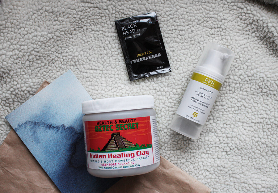 För masker tycker jag om den gröngula från Ren. Då och då använder jag Indian Healing Clay från Aztec Secret. Den är väldigt intensiv och rengör verkligen huden på djupet. Jag kan bara låta den torka innan jag tvättar bort den igen eftersom jag har så känslig hy. Jag har också några Black Head-masker som jag lägger när det behövs. Det jag saknar bland mina ansiktsmasker är en bra återfuktande sådan, någon som har tips?