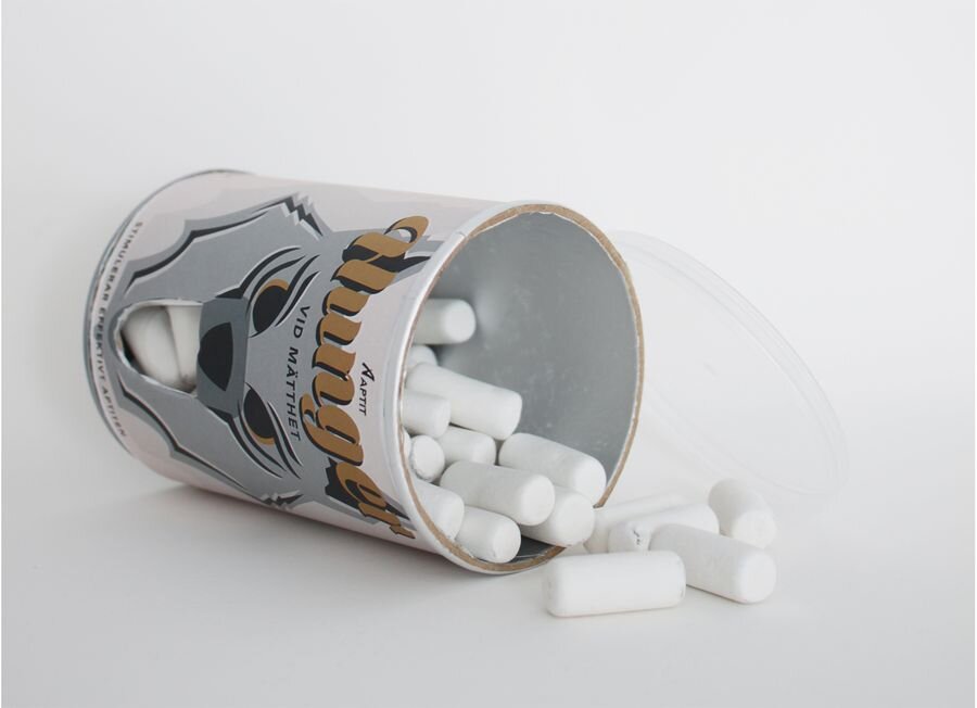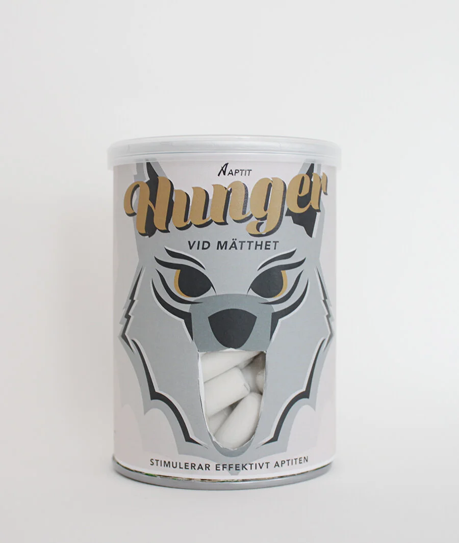 Förpackningen är ett avsågat pringlesrör, skolkritor från lösvikten fick agera hungerpiller. En varg valde jag utifrån ordspråket "hungrig som en varg" såklart. Vargens gap är gjord till ett fönster i förpackningen så att tabletterna syns. Den skarpsynta noterar också vilket trademark produkten ligger licenserad under ;)