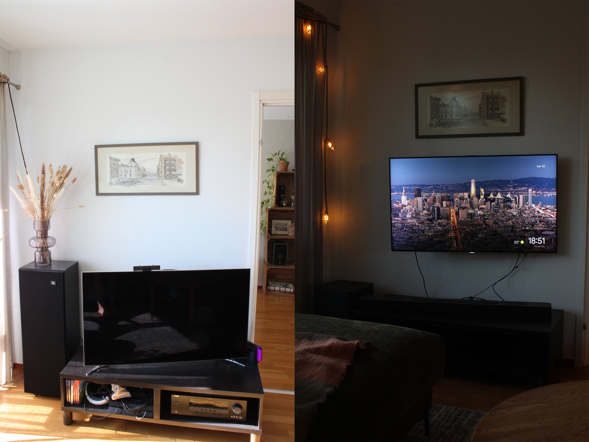 Att få upp den på väggen blev ett riktigt lyft (hehe)! De stora högtalarna byttes ut mot en soundbar. Sedan dessa bilder togs har jag fixat kabellister till både TV och taklampa.